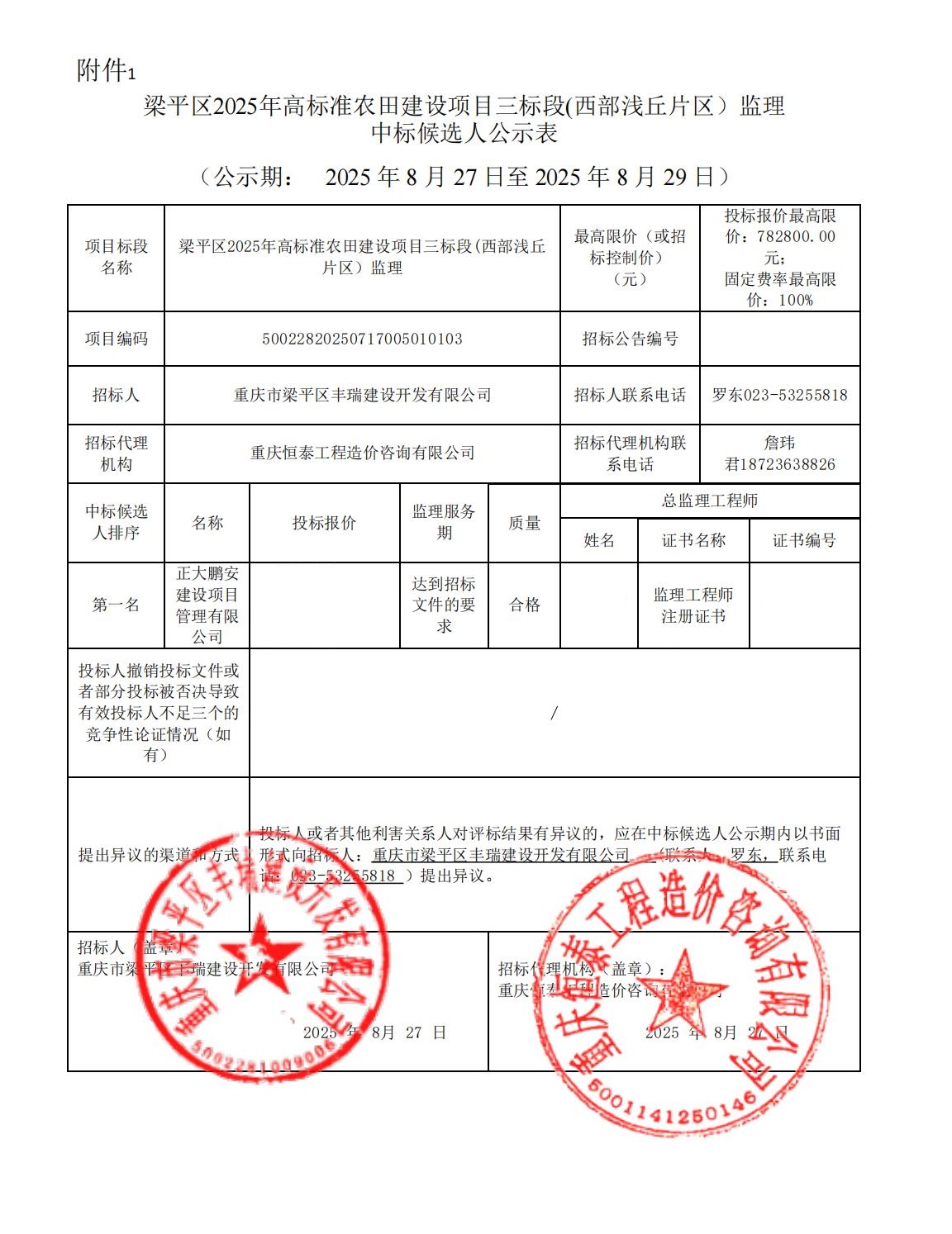 2025年8月27日,經(jīng)評標(biāo)委員會綜合評審,招標(biāo)人確認(rèn),正大鵬安中標(biāo)重慶市梁平區(qū)2025年高標(biāo)準(zhǔn)農(nóng)田建設(shè)項目三標(biāo)段(西部淺丘片區(qū))監(jiān)理。