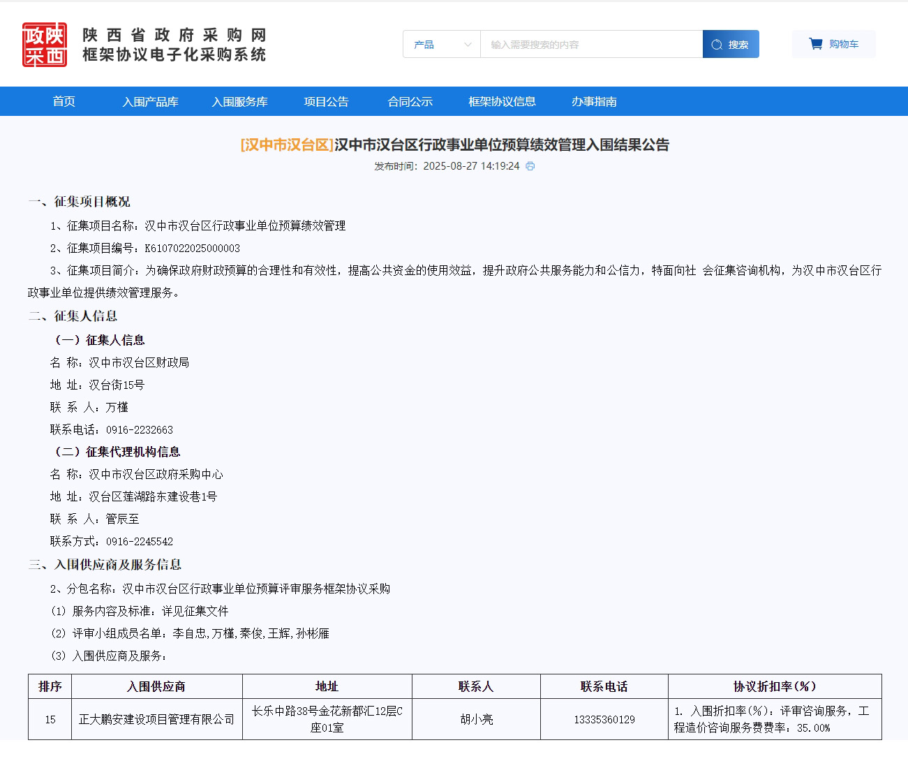 2025年8月28日,經(jīng)評標(biāo)委員會綜合評審,招標(biāo)人確認(rèn),正大鵬安建設(shè)項目管理有限公司入圍漢中市漢臺區(qū)行政事業(yè)單位預(yù)算績效管理項目。