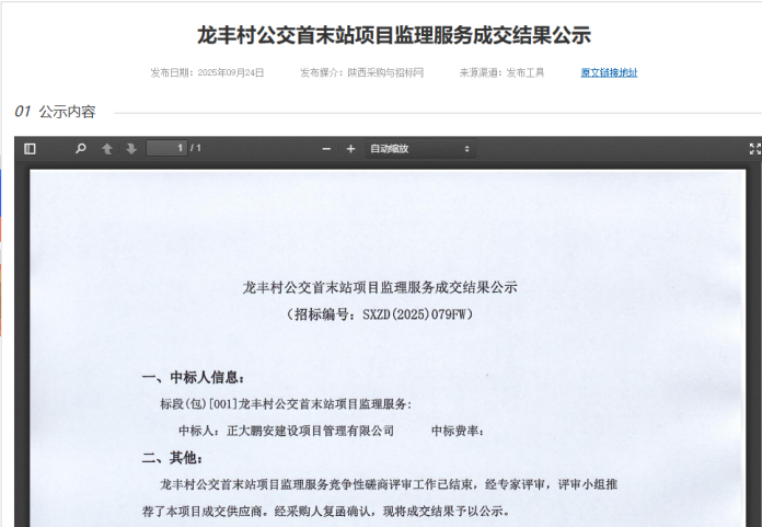 2025年9月22日,經(jīng)評標(biāo)委員會綜合評審,招標(biāo)人確認(rèn)正大鵬安中標(biāo)龍豐村公交首末站項(xiàng)目監(jiān)理服務(wù)項(xiàng)目。