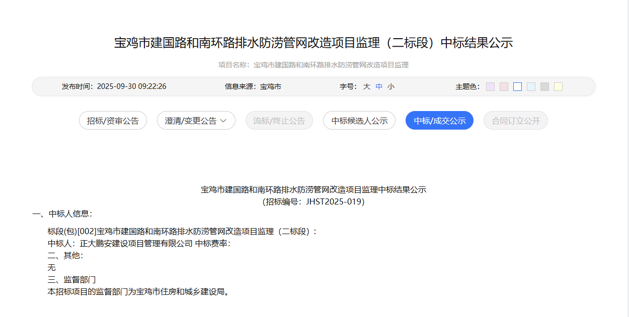 2025年9月24日,經(jīng)評(píng)標(biāo)委員會(huì)綜合評(píng)審,招標(biāo)人確認(rèn)正大鵬安中標(biāo)寶雞市建國(guó)路和南環(huán)路排水防澇管網(wǎng)改造項(xiàng)目監(jiān)理二標(biāo)段項(xiàng)目。