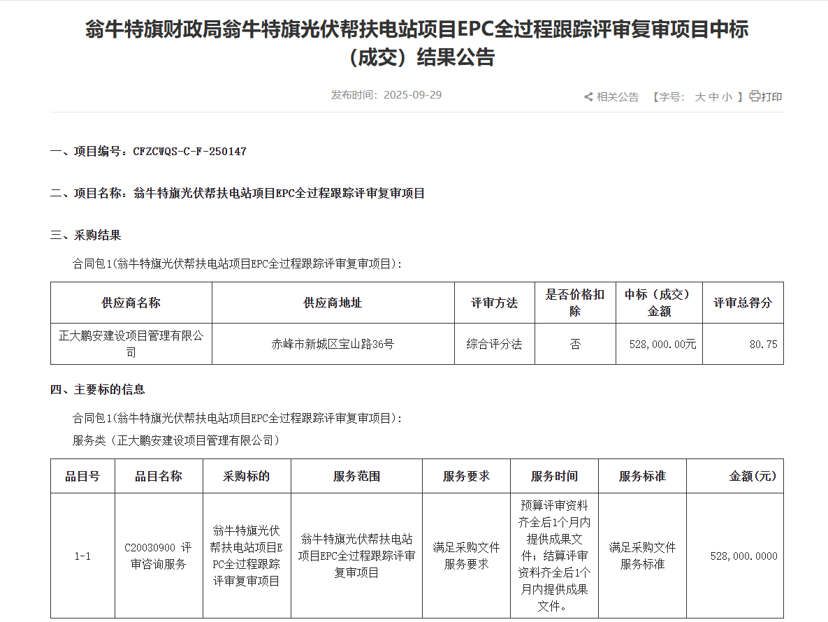 正大鵬安中標內蒙古自治區(qū)赤峰市翁牛特旗財政局翁牛特旗光伏幫扶電站項目EPC全過程跟蹤評審復審項目