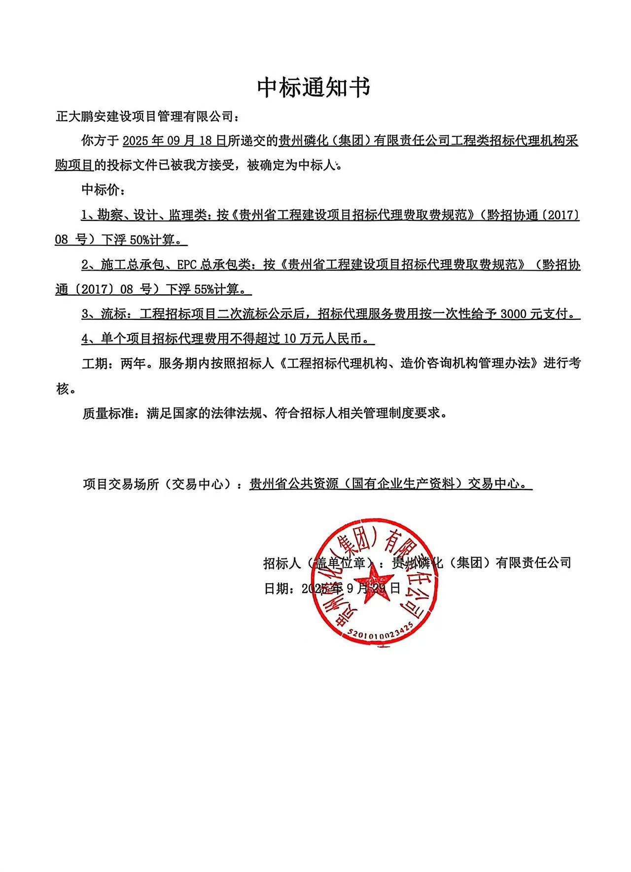正大鵬安中標(biāo)貴州磷化(集團(tuán))有限責(zé)任公司工程類招標(biāo)代理機(jī)構(gòu)采購(gòu)項(xiàng)目